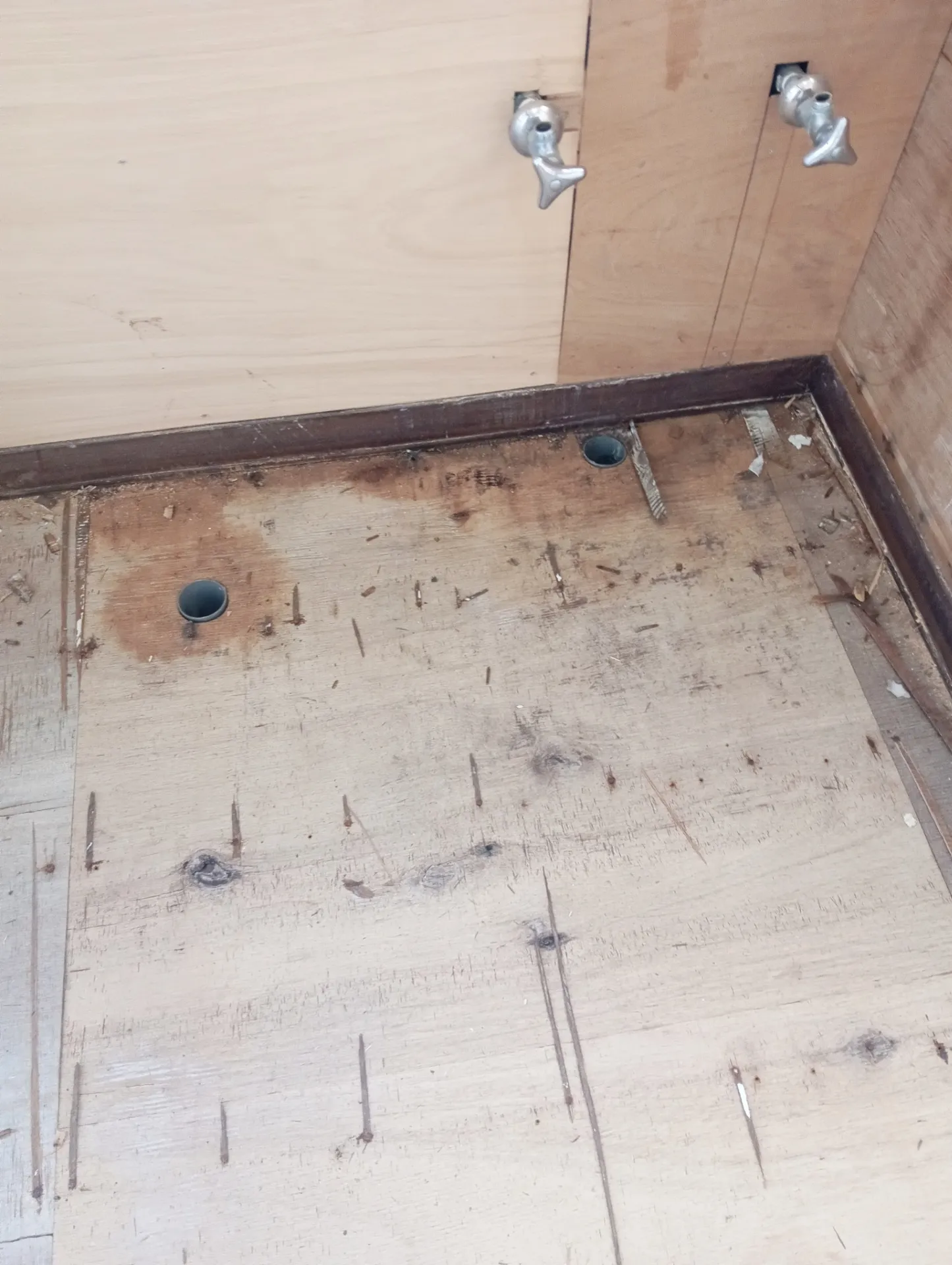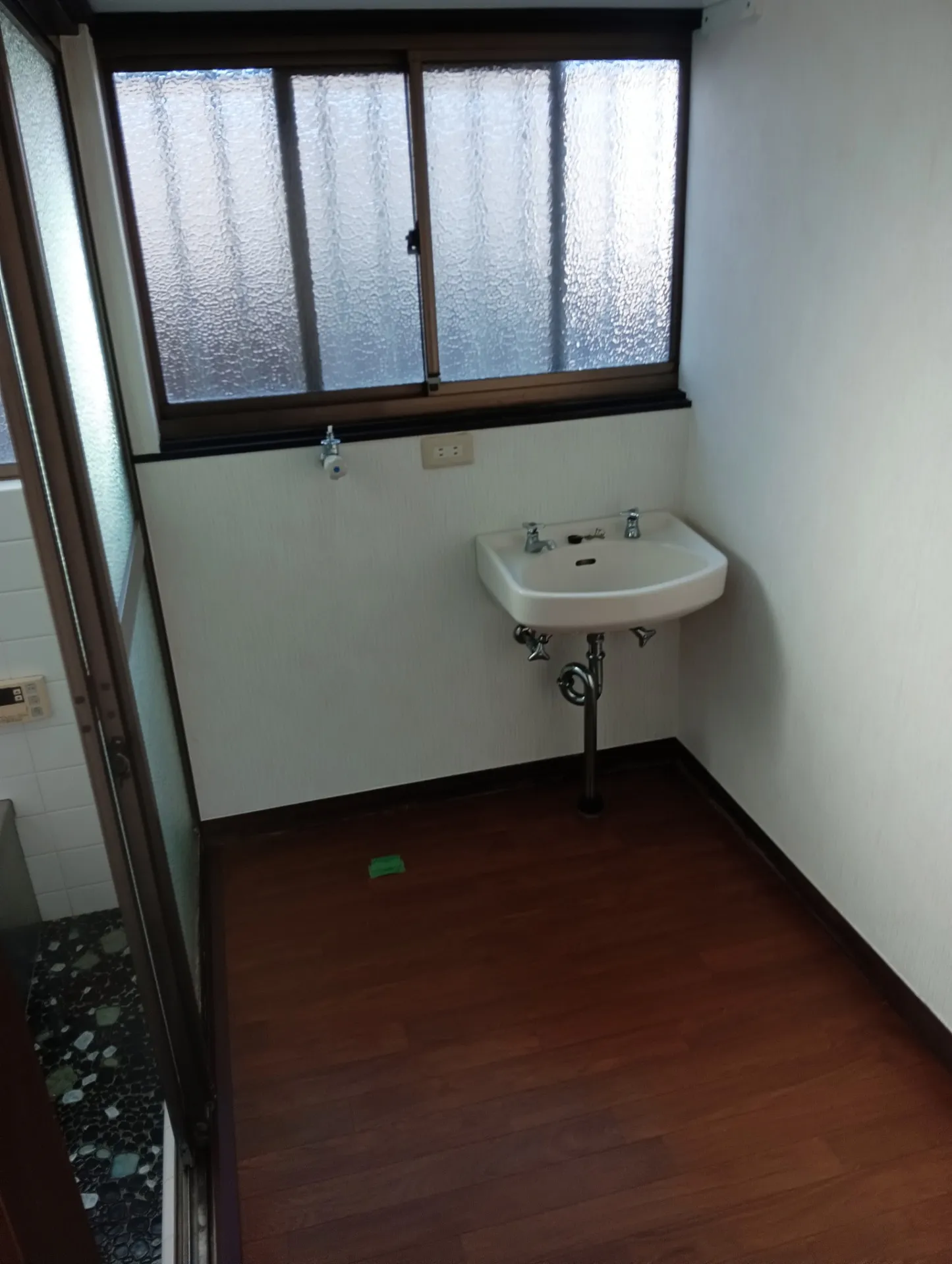 足立区でリフォーム業をしてますリベロの小川です、今回はちょっと古い賃貸戸建ての洗面所に洗面台ではなく手洗いが付いていて壁や床が経年の水ハネで下地までボロボロだったので貼り替えました。